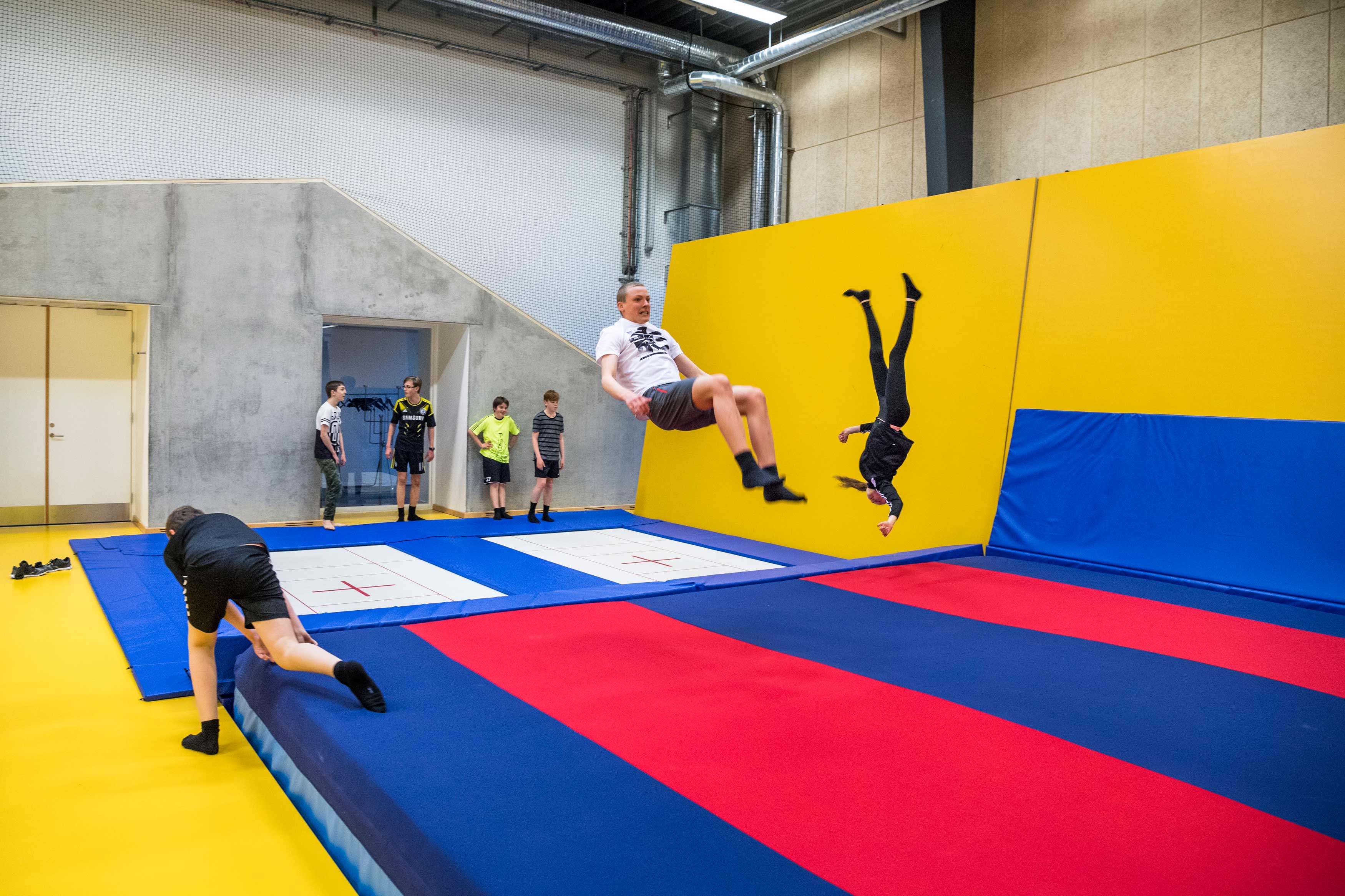 Der er indbygget springgrav i gulvet, samt 2 trampoliner, som giver mulighed for både at øve de første dele af et spring, men også udbygge og udfordre til de meget sværere og mere avancerede spring.