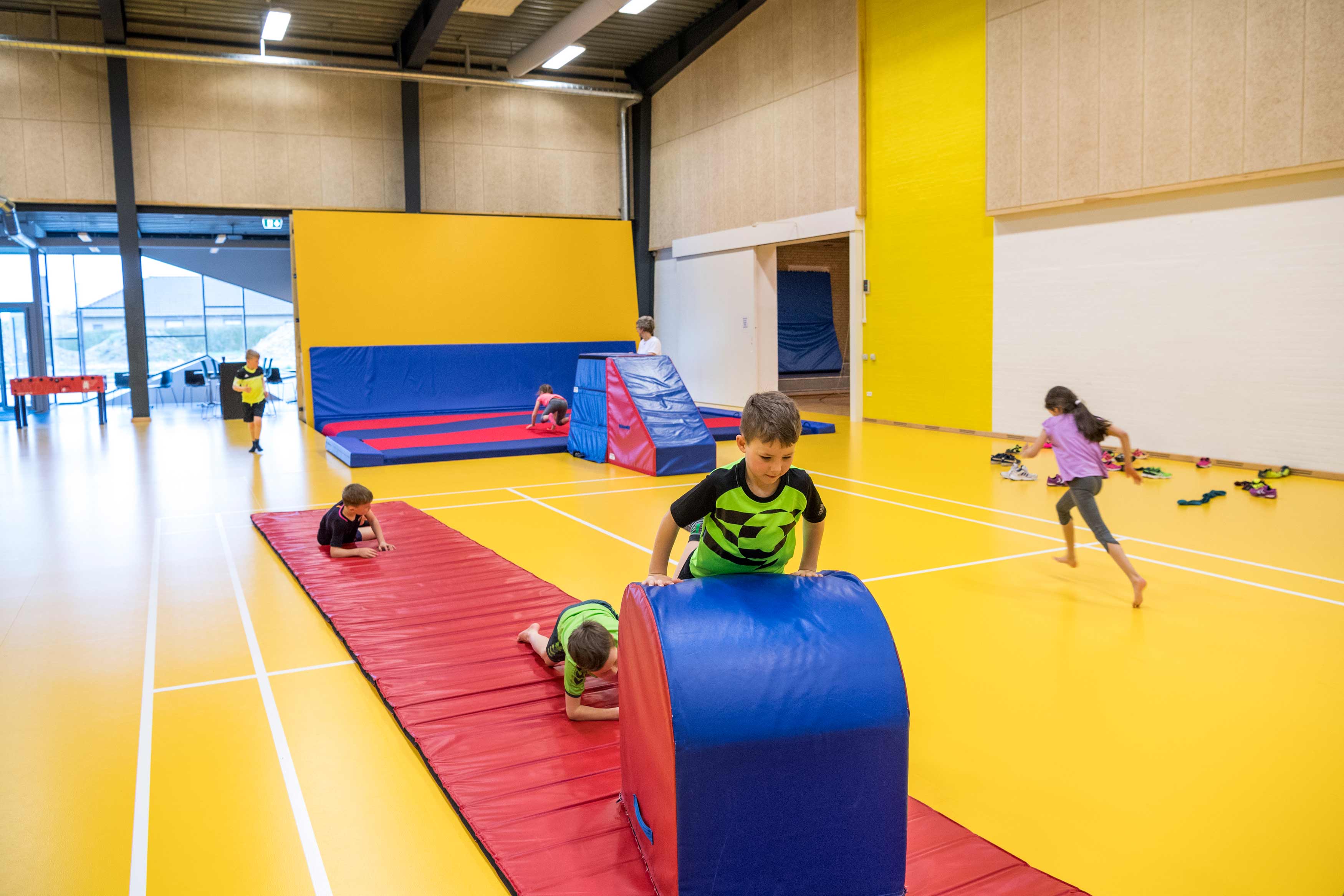 Multisalen er en af de helt nye bygninger i Det Legende Hus, som for alvor understreger leg og aktiviteter. For gymnastikforeningen i Sdr. Felding betyder det nu, at man virkelig kan tilbyde faciliteter til alle niveauer og at alle kan forbedre deres evner markant.
